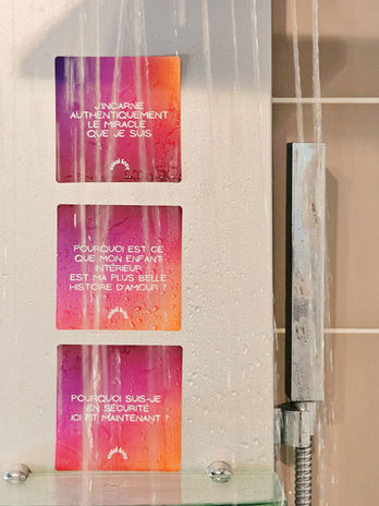 3️⃣ Colle le côté qui résonne le plus avec toi sur un miroir, un mur de douche ou toute surface lisse.